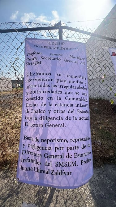 Docentes y padres de familia de la Estancia Infantil del Sindicato de Maestros número 7 “Noé Pérez”, en Chalco, acusan al SMSEM de incumplir acuerdos y tomar represalias contra los hijos de las maestras que denunciaron irregularidades. En el lugar se colocó una manta exigiendo la destitución de la maestra Juana Chimal, señalada por presuntos abusos y actos de intimidación. La comunidad educativa exige transparencia, respeto a los derechos laborales y un alto a las acciones de hostigamiento.
